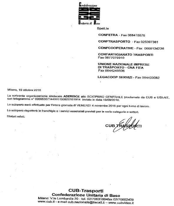 Con la nota del 19 ottobre scorso il sindacato di base Cub Trasporti ha comunicato di aderire allo sciopero generale