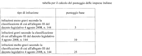 Ad ogni infrazione è stato attribuito il punteggio di indicazione del rischio di seguito indicato, che il Ministero dei Trasporti ha individuato tenendo conto della gravità delle violazioni (stabilita dal d.lgvo n.245/2010), nonché della consistenza del parco veicolare al fine di evitare che le imprese più dimensionate, aventi maggiori probabilità di incorrere in violazioni, risultassero penalizzate rispetto a quelle che possiedono meno veicoli.