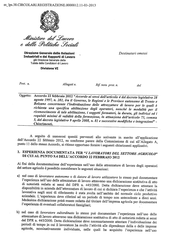 – Sicurezza – Formazione per l’utilizzo di particolari attrezzature – Circolare